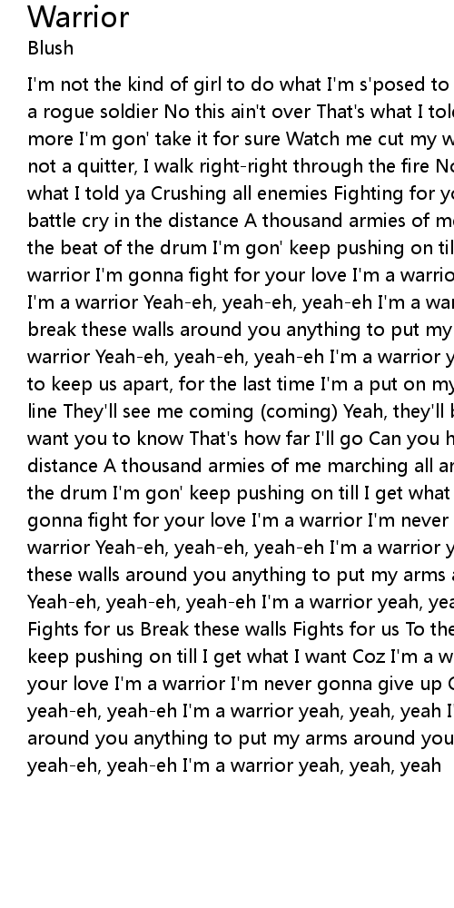 I'm not the kind of girl to do what I'm s'posed to Yeah, I'm a rebel yeah, Imma a rogue soldier No this ain't over That's what I told ya I just want me some more I'm gon' take it for sure Watch me cut my way through the barbed wire I'm not a quitter, I walk right-right through the fire No, this ain't over That's what I told ya Crushing all enemies Fighting for you and me Can you hear the battle cry in the distance A thousand armies of me marchin' round the world to the beat of the drum I'm gon' keep pushing on till I get what I want Coz I'm a warrior I'm gonna fight for your love I'm a warrior I'm never gonna give up Coz I'm a warrior Yeah-eh, yeah-eh, yeah-eh I'm a warrior yeah, yeah, yeah I'm gonna break these walls around you anything to put my arms around you Coz I'm a warrior Yeah-eh, yeah-eh, yeah-eh I'm a warrior yeah, yeah, yeah They've tried to keep us apart, for the last time I'm a put on my armour, drama on the front line They'll see me coming (coming) Yeah, they'll be running (running) I just want you to know That's how far I'll go Can you hear the battle cry in the distance A thousand armies of me marching all around the world To the beat of the drum I'm gon' keep pushing on till I get what I want Coz I'm a warrior I'm gonna fight for your love I'm a warrior I'm never gonna give up Coz I'm a warrior Yeah-eh, yeah-eh, yeah-eh I'm a warrior yeah, yeah, yeah I'm gonna break these walls around you anything to put my arms around you Coz I'm a warrior Yeah-eh, yeah-eh, yeah-eh I'm a warrior yeah, yeah, yeah Break these walls Fights for us Break these walls Fights for us To the beat of the drum I'm gon' keep pushing on till I get what I want Coz I'm a warrior I'm gonna fight for your love I'm a warrior I'm never gonna give up Coz I'm a warrior Yeah-eh, yeah-eh, yeah-eh I'm a warrior yeah, yeah, yeah I'm gonna break these walls around you anything to put my arms around you Coz I'm a warrior Yeah-eh, yeah-eh, yeah-eh I'm a warrior yeah, yeah, yeah |