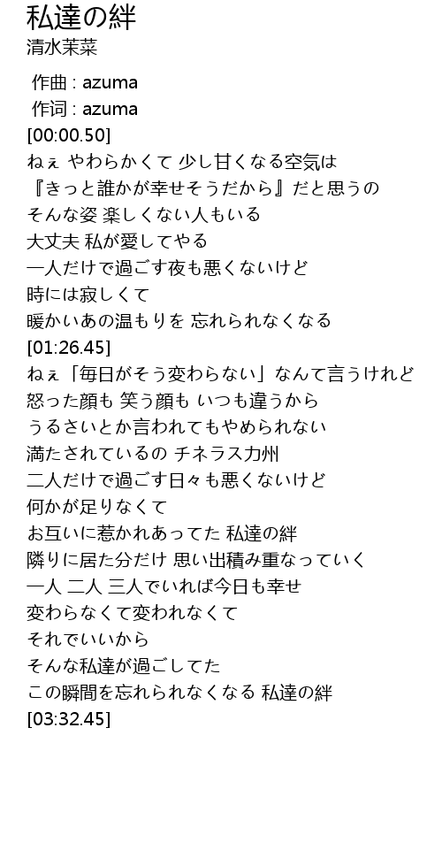 | [03:18.12] | この瞬間を忘れられなくなる 私達の絆 |
