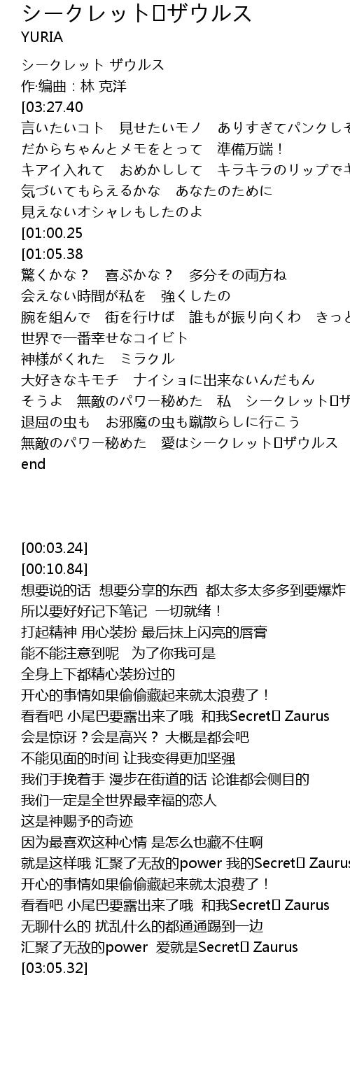 | [02:44.43][01:05.38] | ほらね しっぽがはみだしちゃう 私 シークレット♡ザウルス |