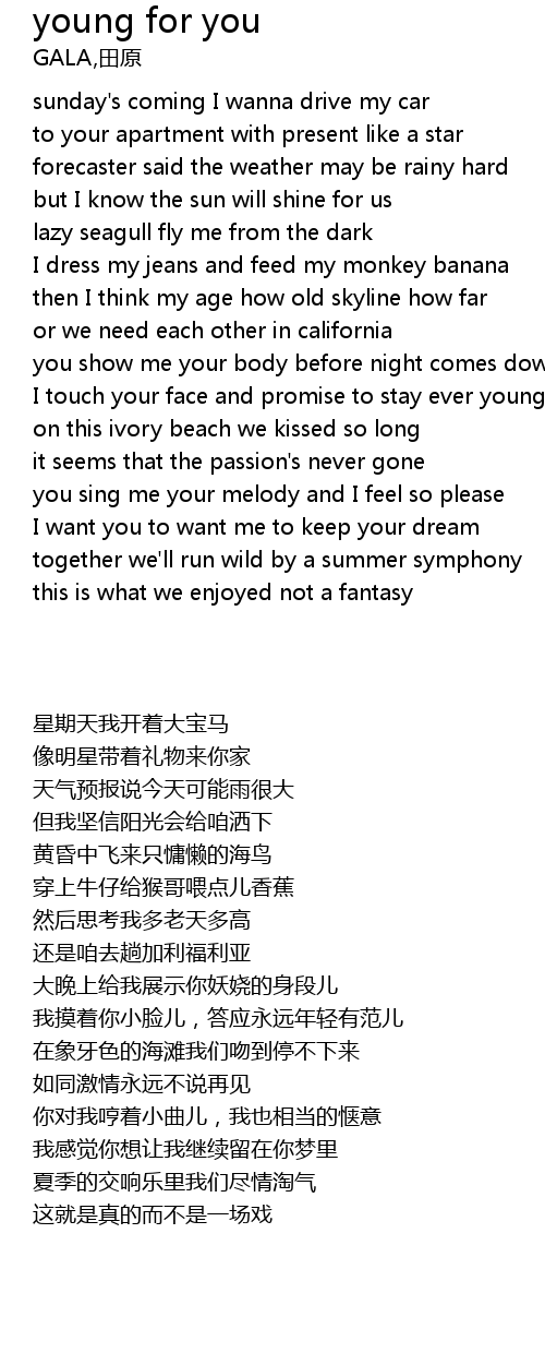 | [01:10.58] | I touch your face and promise to stay ever young |