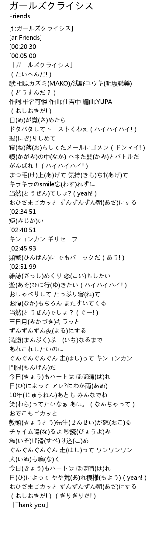 | [01:00.06][02:40.51] | ぐんぐんぐんぐん 走(はし)って キンコンカン ギリセーフ |