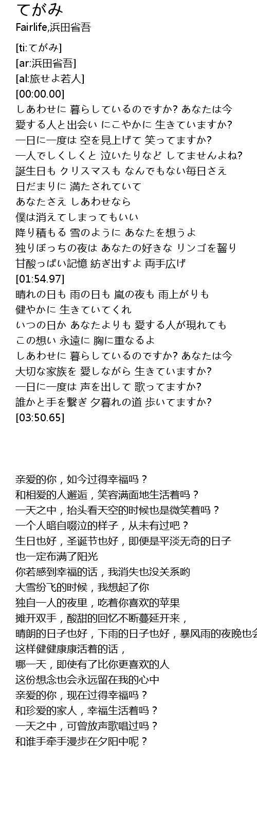 | [03:12.78] | しあわせに 暮らしているのですか? あなたは今 |