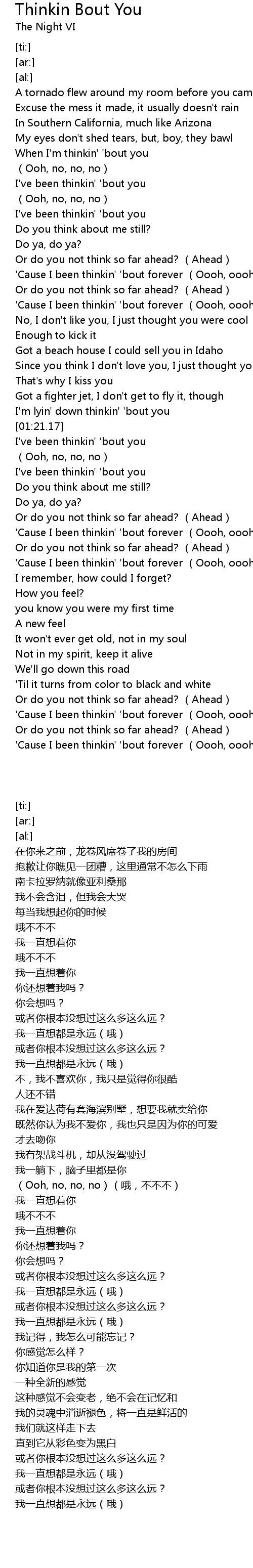 | [00:16.13] | When I'm thinkin' 'bout you |