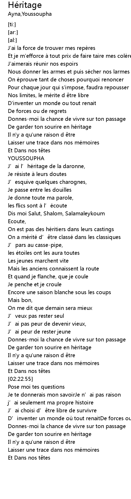 | [02:57.86] | De garder ton sourire en he ritage |