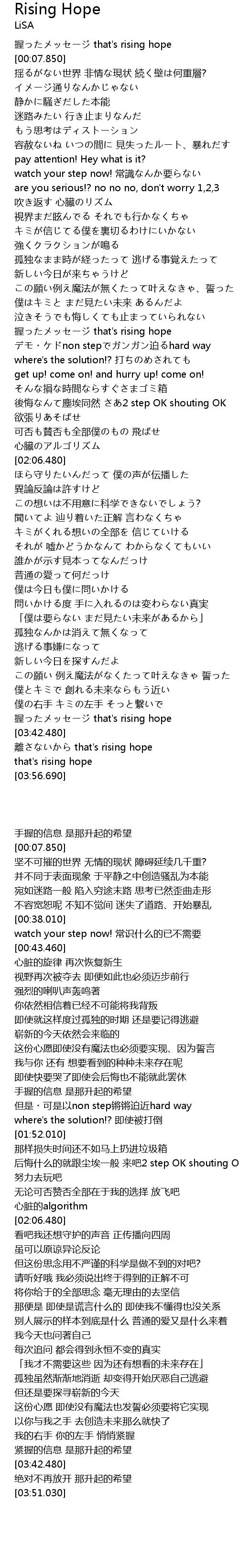 | [03:39.060] | 握ったメッセージ that's rising hope |