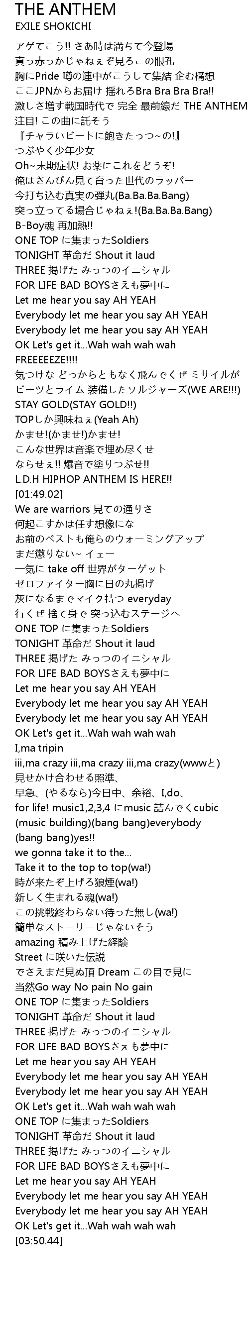 | [00:43.66] | 激しさ増す戦国時代で 完全 最前線だ THE ANTHEM |