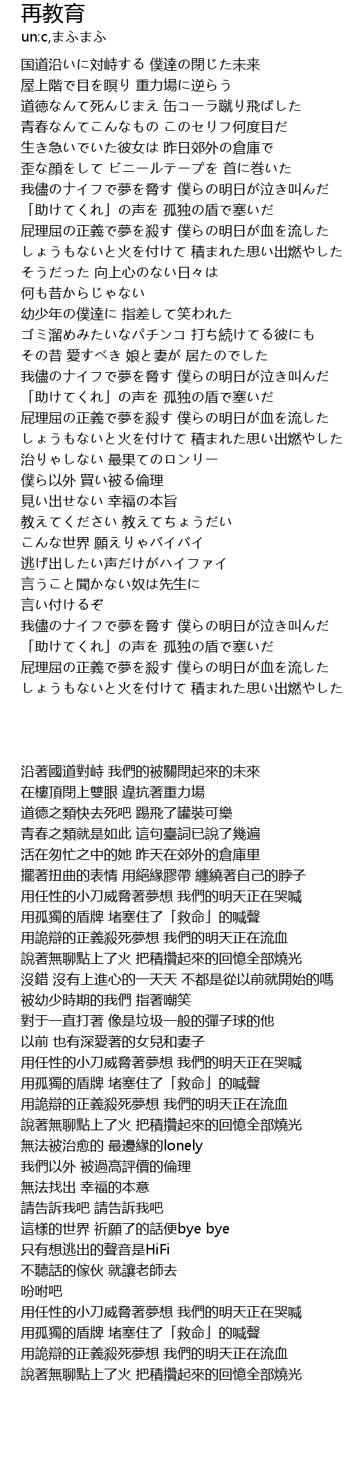 | [01:23.54] | 屁理屈の正義で夢を殺す 僕らの明日が血を流した |