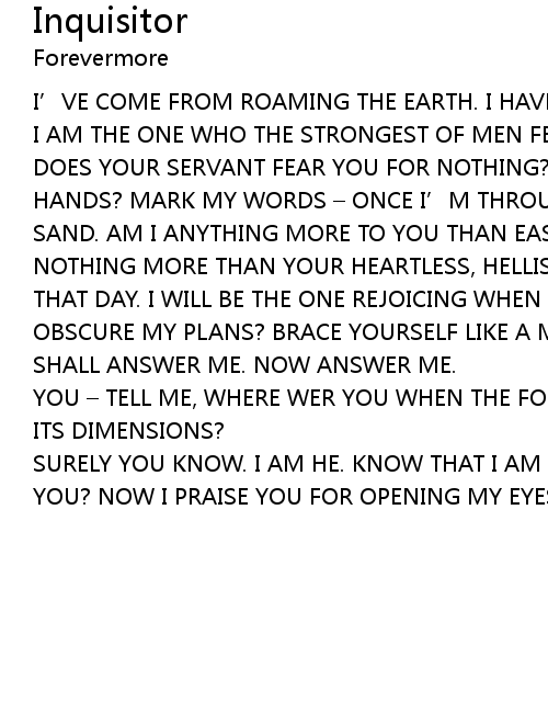 | I’VE COME FROM ROAMING THE EARTH. I HAVE KILLED. I HAVE SOUGHT AND DESTROYED. I AM THE ONE WHO THE STRONGEST OF MEN FEAR. TREMBLE NOW AS I PLOT YOUR DEMISE. DOES YOUR SERVANT FEAR YOU FOR NOTHING? HAVE YOU NOT BLESSED THE WORK OF HIS HANDS? MARK MY WORDS – ONCE I’M THROUGH, HIS DEVOTION WILL SINK LIKE THE SAND. AM I ANYTHING MORE TO YOU THAN EASY PREY? WAS MY BIRTH THE START OF NOTHING MORE THAN YOUR HEARTLESS, HELLISH GAME? MAY THOSE WHO CURSE DAYS CURSE THAT DAY. I WILL BE THE ONE REJOICING WHEN I REACH MY GRAVE. WHO ARE YOU TO OBSCURE MY PLANS? BRACE YOURSELF LIKE A MAN. NOW I WILL QUESTION YOU, AND YOU SHALL ANSWER ME. NOW ANSWER ME. | |