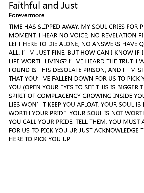 | TIME HAS SLIPPED AWAY. MY SOUL CRIES FOR PEACE; FOR UNDERSTANDING. IN THIS MOMENT, I HEAR NO VOICE; NO REVELATION FINDS ME. NO ANSWERS TO QUENCH MY THIRST. LEFT HERE TO DIE ALONE, NO ANSWERS HAVE QUENCHED MY THIRST. AM I ALONE? WORST OF ALL, I’M JUST FINE. BUT HOW CAN I KNOW IF I AM FREE, TRULY? AM I FREE? IS THIS LIFE WORTH LIVING? I’VE HEARD THE TRUTH WILL SET ME FREE, BUR ALL THAT I’VE FOUND IS THIS DESOLATE PRISON, AND I’M STILL BREATHING. YOU MUST ACKNOWLEDGE THAT YOU’VE FALLEN DOWN FOR US TO PICK YOU UP. IS YOUR SOUL SO WORTHLESS TO YOU (OPEN YOUR EYES TO SEE THIS IS BIGGER THAN YOU) THAT YOU WON’T FIGHT THIS SPIRIT OF COMPLACENCY GROWING INSIDE YOU? CAN’T YOU SEE WHAT’S AT STAKE? THE LIES WON’T KEEP YOU AFLOAT. YOUR SOUL IS NOT WORTH YOUR DECEPTION. IT’S NOT WORTH YOUR PRIDE. YOUR SOUL IS NOT WORTH YOUR DECEPTION. IT’S NOT WORTH ! WHAT YOU CALL YOUR PRIDE. TELL THEM. YOU MUST ACKNOWLEDGE THAT YOU’VE FALLEN DOWN FOR US TO PICK YOU UP. JUST ACKNOWLEDGE THAT YOU’VE FALLEN DOWN. WE’VE COME HERE TO PICK YOU UP. |