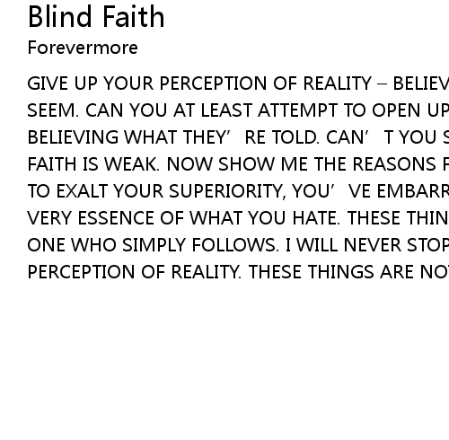 | GIVE UP YOUR PERCEPTION OF REALITY BELIEVING THINGS ARE EXACTLY AS THEY SEEM. CAN YOU AT LEAST ATTEMPT TO OPEN UP YOUR MIND? YOU BLAME THOSE FOR SIMPLY BELIEVING WHAT THEY' RE TOLD. CAN' T YOU SEE THE IRONY? AND I AGREE, BLIND FAITH IS WEAK. NOW SHOW ME THE REASONS FOR YOUR BELIEFS. IGNORANCE. ATTEMPTING TO EXALT YOUR SUPERIORITY, YOU' VE EMBARRASSED YOURSELF. YOU HAVE BECOME THE VERY ESSENCE OF WHAT YOU HATE. THESE THINGS ARE NOT AS THEY SEEM. I WILL NOT BE ONE WHO SIMPLY FOLLOWS. I WILL NEVER STOP SEEKING THE TRUTH. GIVE UP YOUR PERCEPTION OF REALITY. THESE THINGS ARE NOT AS THEY SEEM. |