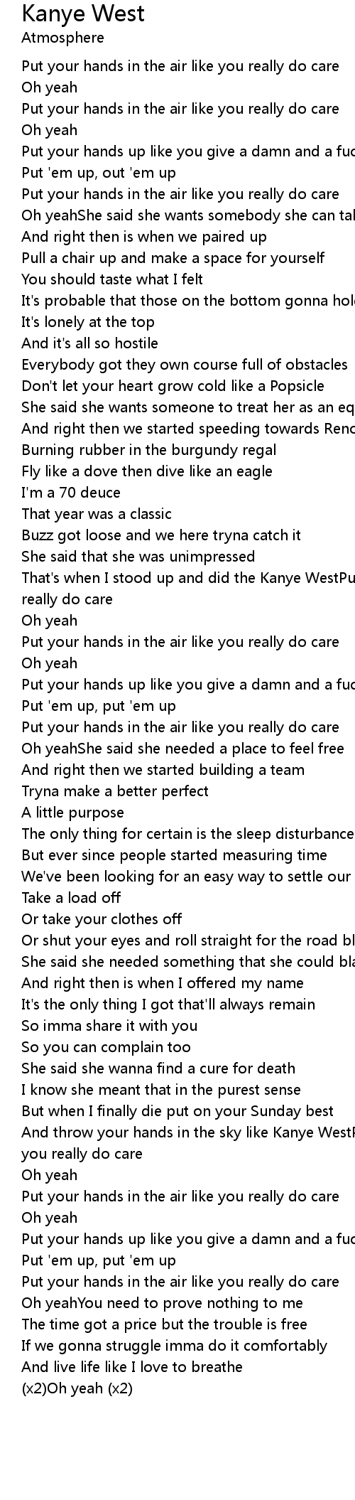 And throw your hands in the sky like Kanye WestPut your hands in the air like you really do care |