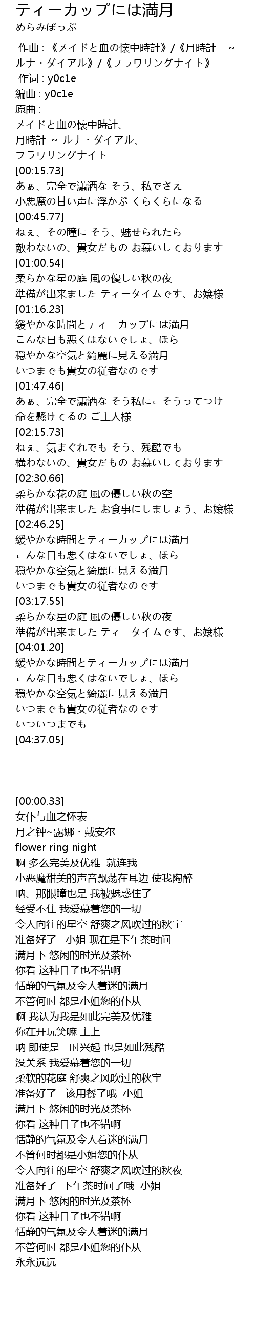 | [00:00.00] | 作曲 : 《メイドと血の懐中時計》/《月時計 ~ ルナ・ダイアル》/《フラワリングナイト》 |