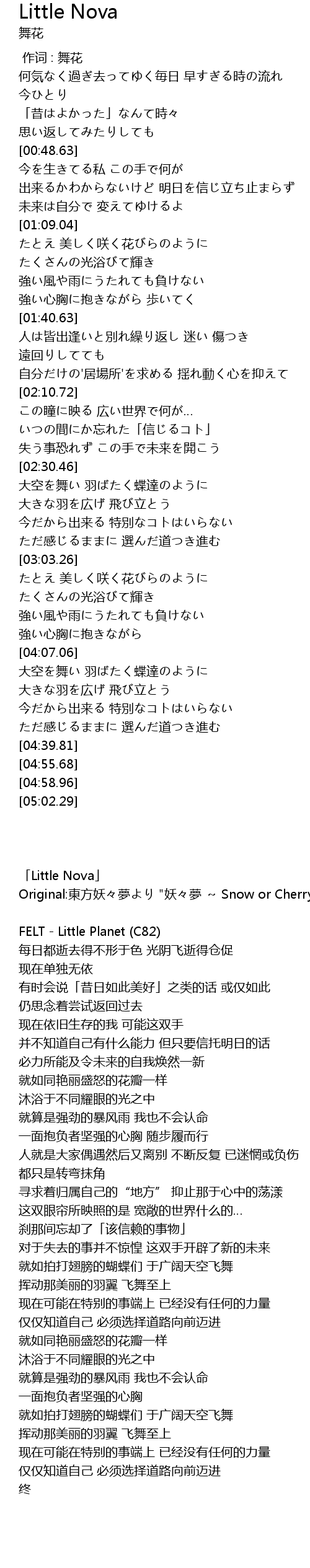 | [00:22.62] | 何気なく過ぎ去ってゆく毎日 早すぎる時の流れ 今ひとり |