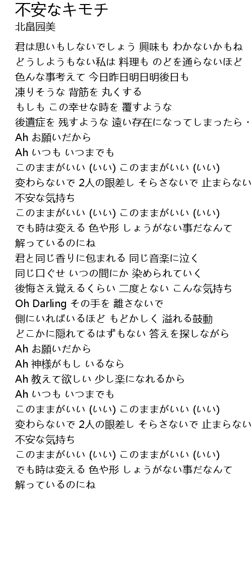 | 変わらないで 2人の眼差し そらさないで 止まらない 不安な気持ち | |