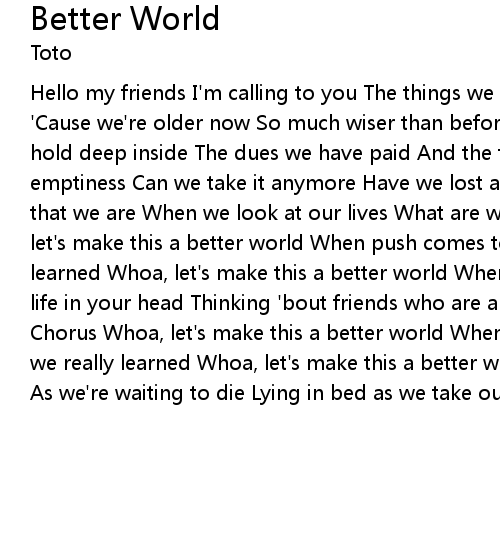 Hello my friends I'm calling to you The things we believed Are no longer true 'Cause we're older now So much wiser than before The pain that we've felt We hold deep inside The dues we have paid And the tears we have cried And the emptiness Can we take it anymore Have we lost all our faith in our God And all that we are When we look at our lives What are we fighting for Chorus Whoa, let's make this a better world When push comes to shove What have we really learned Whoa, let's make this a better world When you're lying awake with your life in your head Thinking 'bout friends who are already dead We can change Chorus Whoa, let's make this a better world When push comes to shove What have we really learned Whoa, let's make this a better world Is there hope for us all As we're waiting to die Lying in bed as we take our last sigh |