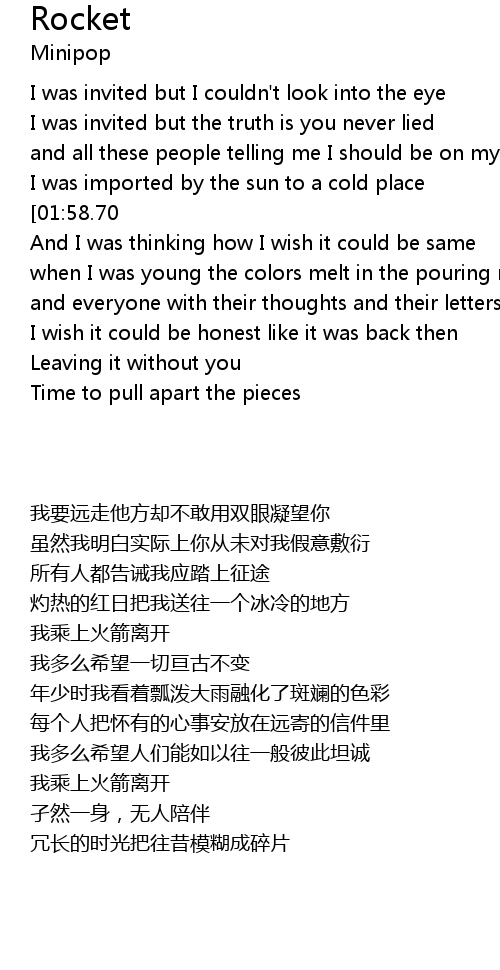 | [00:59.65][01:58.70] | I'm on a rocket |