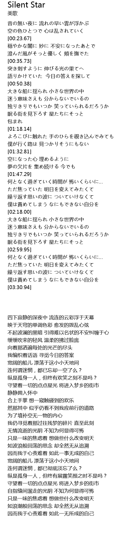 | [02:54.43] | 眠る街を見下ろす 星たちにそっと |
