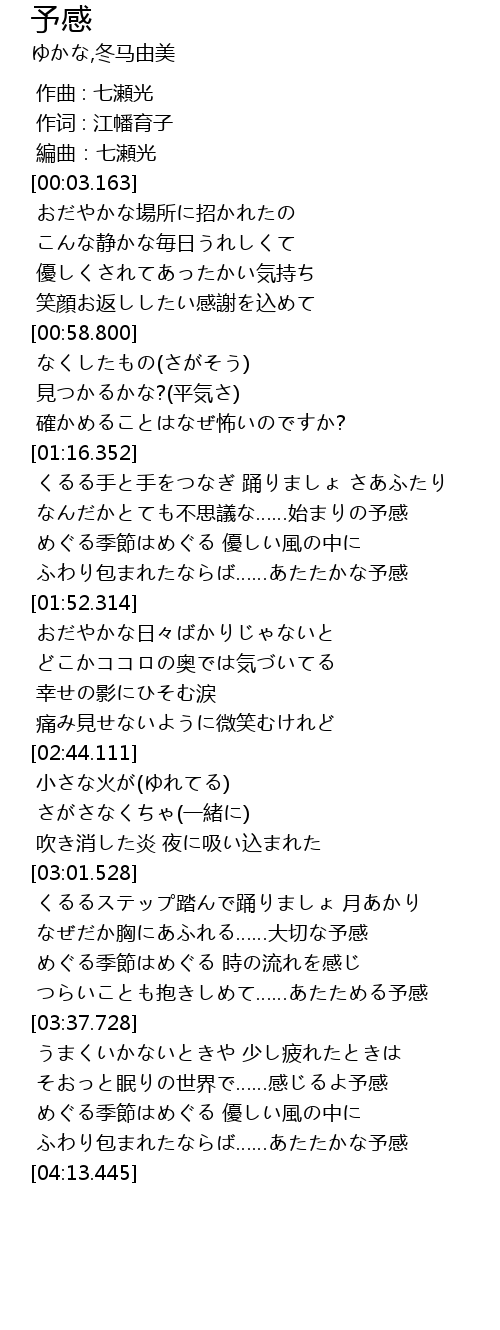 | [03:29.692] | つらいことも抱きしめて……あたためる予感 |