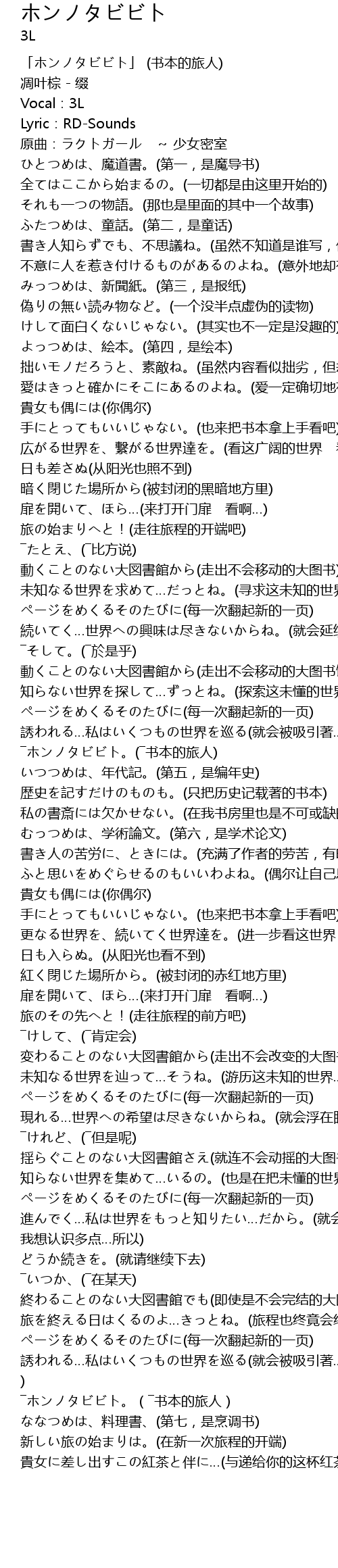 | [00:00.00] | 「ホンノタビビト」 (书本的旅人) |