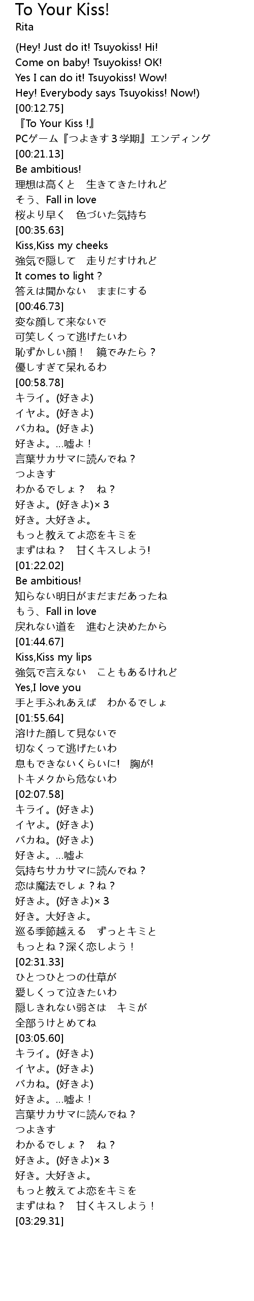 | [00:01.63] | Hey! Just do it! Tsuyokiss! Hi! |