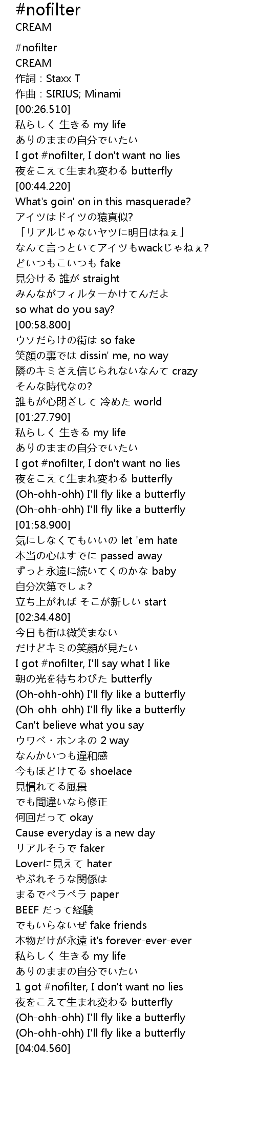 | [00:36.540] | I got #nofilter, I don't want no lies |
