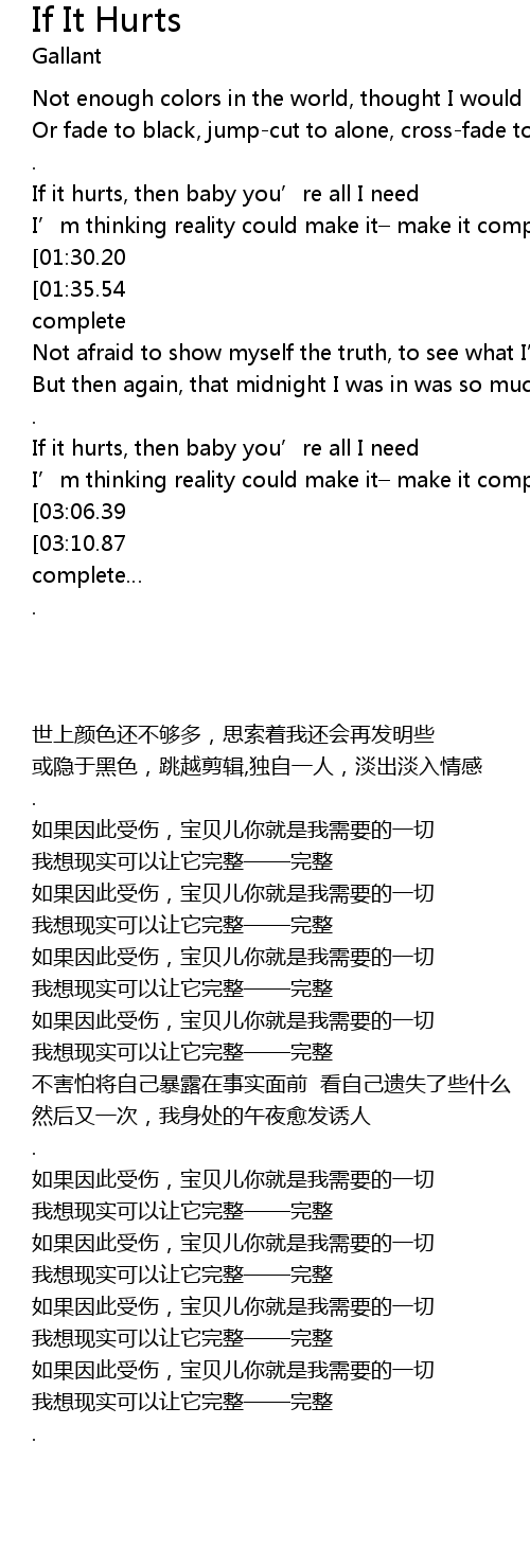 | [01:42.70][01:30.20][01:18.12] | If it hurts, then baby you’re all I need |