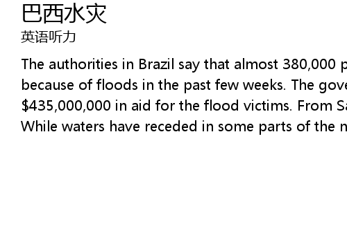 | The authorities in Brazil say that almost 380, 000 people still can' t return home because of floods in the past few weeks. The government has released more than 435, 000, 000 in aid for the flood victims. From Sao Paulo, here is Gary Duffy. While waters have receded in some parts of the north and n |