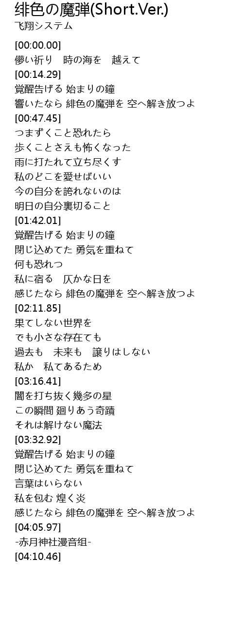 | [00:39.01] | 響いたなら 緋色の魔弾を 空へ解き放つよ |
