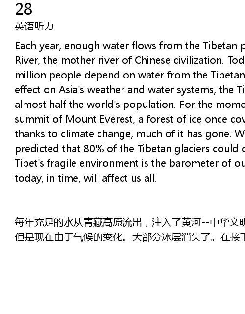 | 每年充足的水从青藏高原流出,注入了黄河--中华文明的母亲河。现如今仅中国就有3亿人依靠,从青藏高原的流下的水生活。由于对亚洲气候和水资源体系的深远影响,青藏高原养活了差不多一半的世界人口。至少在现在就是这样。在接近珠穆朗玛峰峰顶的地方,冰层曾经覆盖过大部分的地域。 但是现在由于气候的变化。大部分冰层消失了。在接下来的30年里,预计西藏80%的冰川将会消失。从许多方面来说,西藏脆弱的环境是世界生态的晴雨表。它今天发生了什么,迟早会影响到所有人。 |