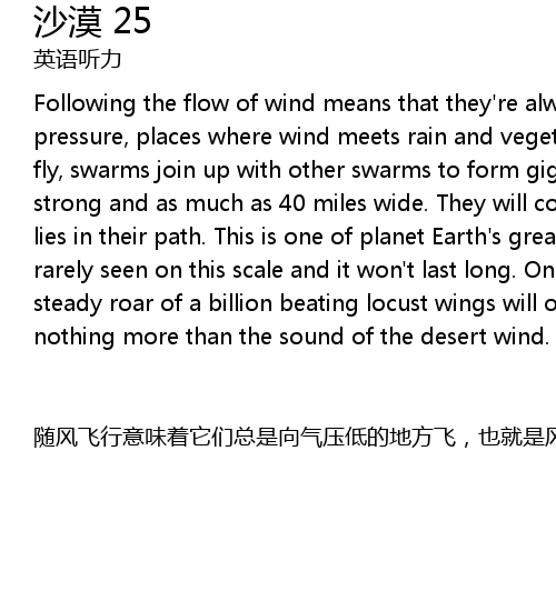 | Following the flow of wind means that they' re always heading toward areas of low pressure, places where wind meets rain and vegetation starts to grow. As they fly, swarms join up with other swarms to form gigantic plagues several billions strong and as much as 40 miles wide. They will consume every edible thing that lies in their path. This is one of planet Earth' s greatest spectacles. It' s rarely seen on this scale and it won' t last long. Once the food has gone, the steady roar of a billion beating locust wings will once again be replaced by nothing more than the sound of the desert wind. | |