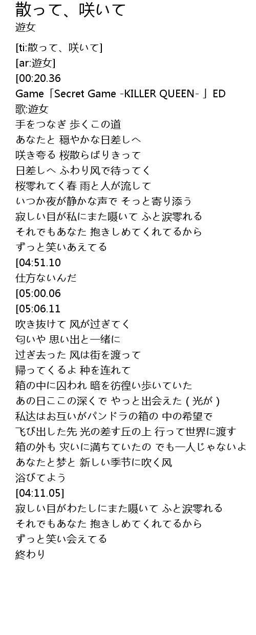 | [00:05.12] | Game「Secret Game -KILLER QUEEN- 」ED |