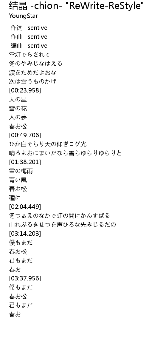 | [02:50.959] | 冬つぁえのなかで虹の闇にかんすばる |
