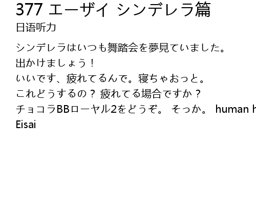 | シンデレラはいつも舞踏会を夢見ていました。 出かけましょう! いいです、疲れてるんで。寝ちゃおっと。 これどうするの? 疲れてる場合ですか? チョコラBBローヤル2をどうぞ。 そっか。 human health care の Eisai |