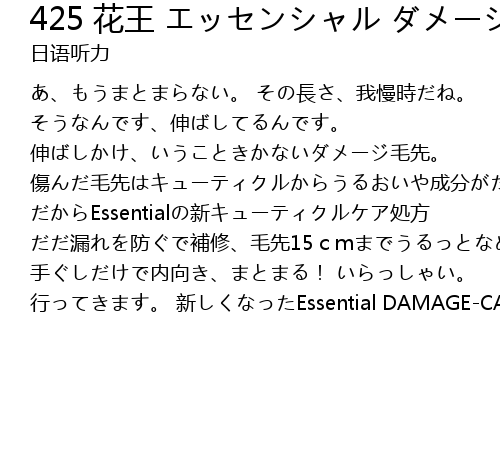 | あ、もうまとまらない。 その長さ、我慢時だね。 そうなんです、伸ばしてるんです。 伸ばしかけ、いうこときかないダメージ毛先。 傷んだ毛先はキューティクルからうるおいや成分がだだ漏れ。 だからEssentialの新キューティクルケア処方 だだ漏れを防ぐで補修、毛先15cmまでうるっとなめらか。 手ぐしだけで内向き、まとまる! いらっしゃい。 行ってきます。 新しくなったEssential DAMAGE-CARE |