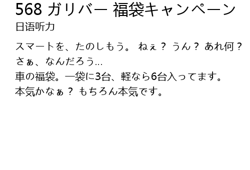 スマートを、たのしもう。 ねぇ? うん? あれ何? さぁ、なんだろう… 車の福袋。一袋に3台、軽なら6台入ってます。 本気かなぁ? もちろん本気です。