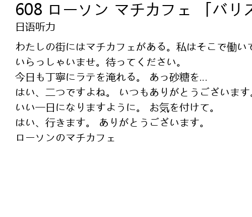 | わたしの街にはマチカフェがある。私はそこで働いている。 いらっしゃいませ。待ってください。 今日も丁寧にラテを淹れる。 あっ砂糖を… はい、二つですよね。 いつもありがとうございます。 いい一日になりますように。 お気を付けて。 はい、行きます。 ありがとうございます。 ローソンのマチカフェ |