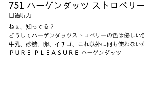 ねぇ、知ってる? どうしてハーゲンダッツストロベリーの色は優しい色なのか? 牛乳、砂糖、卵、イチゴ、これ以外に何も使わないからなんだって。この色が、美味しさの証し。 PURE PLEASURE ハーゲンダッツ