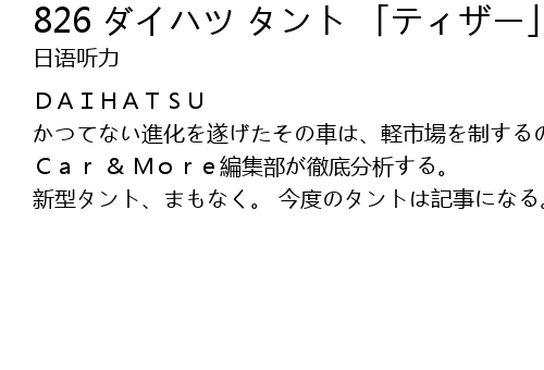 | DAIHATSU かつてない進化を遂げたその車は、軽市場を制するのか。 Car & More編集部が徹底分析する。 新型タント、まもなく。 今度のタントは記事になる。 |