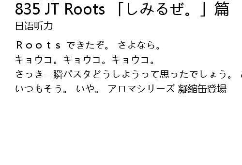 Roots できたぞ。 さよなら。 キョウコ。キョウコ。キョウコ。 さっき一瞬パスタどうしようって思ったでしょう。 あぁ。 いつもそう。 いや。 アロマシリーズ 凝縮缶登場