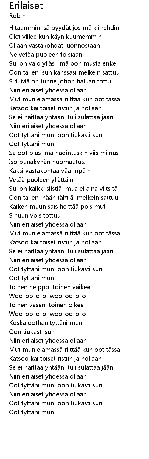 | [03:04.64] | Niin erilaiset yhdess ollaan |