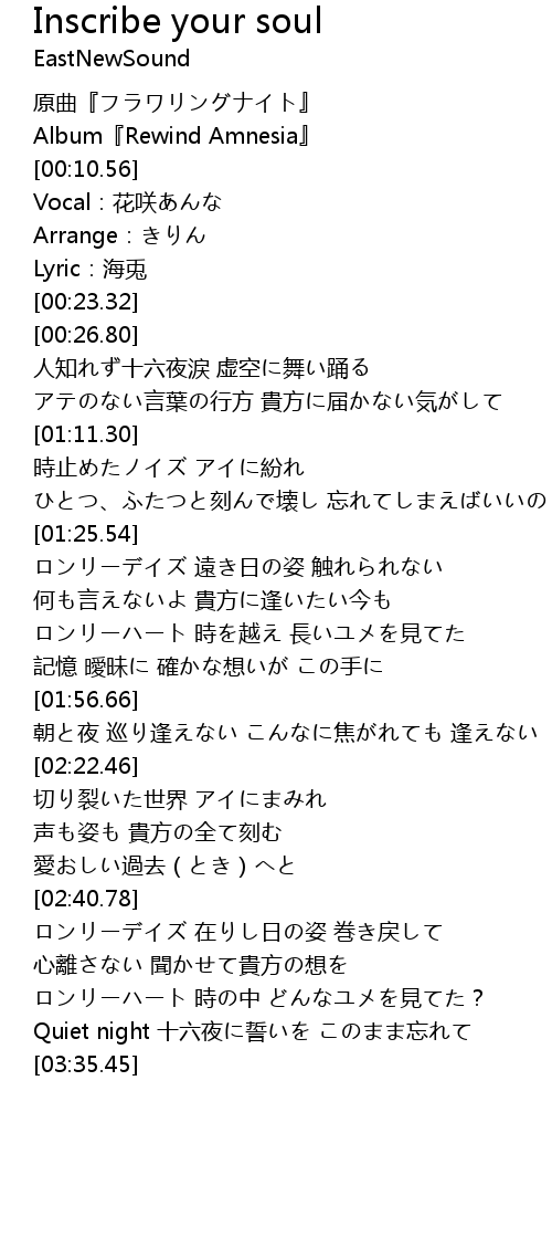 | [03:12.45] | Quiet night 十六夜に誓いを このまま忘れて |