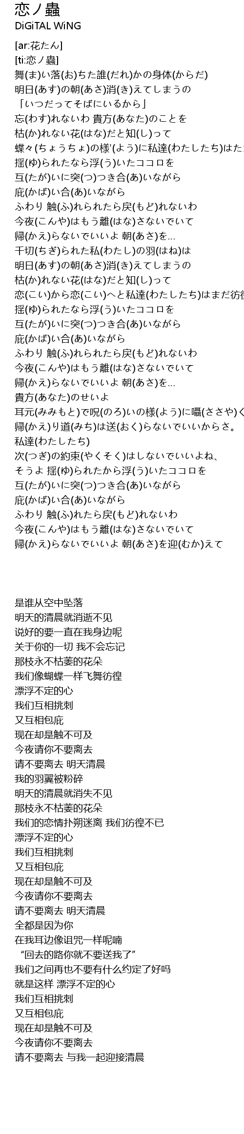 | [01:03.25] | 蝶々(ちょうちょ)の様'(よう)に私達(わたしたち)はただ彷徨(さまよ)う |