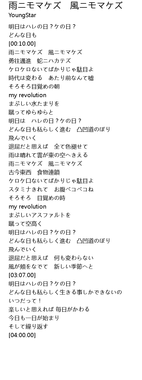 | Song | 雨ニモマケズ 風ニモマケズ |