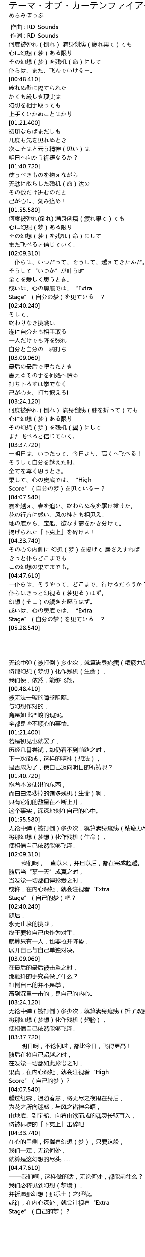 | [00:01.300] | 何度被弾れ(倒れ) 満身创痍(疲れ果て)ても 心に幻想(梦)ある限り |