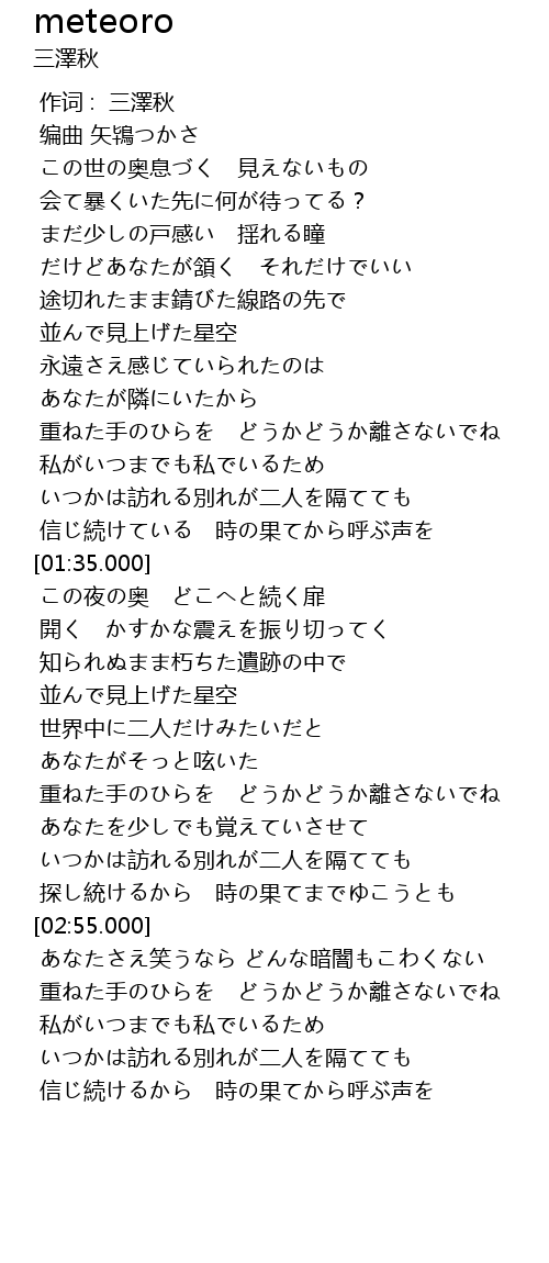| [02:26.600] | 重ねた手のひらを どうかどうか離さないでね |