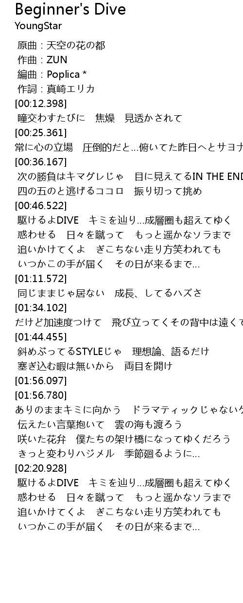 | [02:32.032] | 駆けるよDIVE キミを辿り…成層圈も超えてゆく |