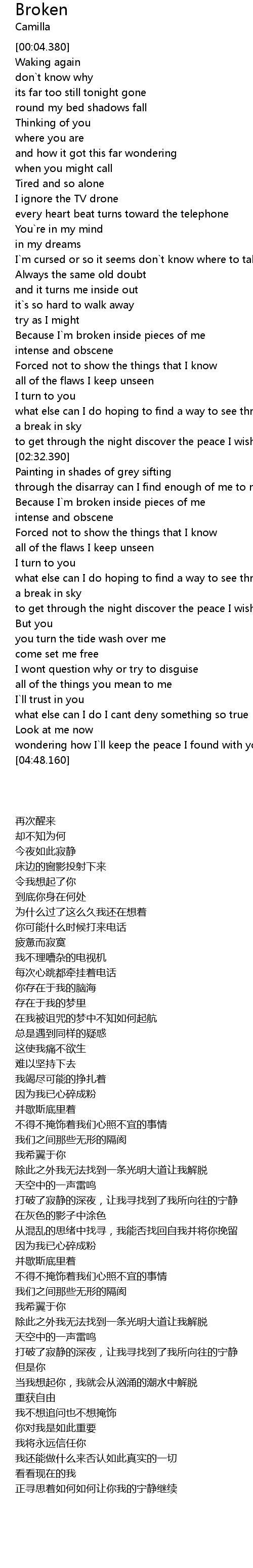 | [01:45.690] | Because I`m broken inside pieces of me |