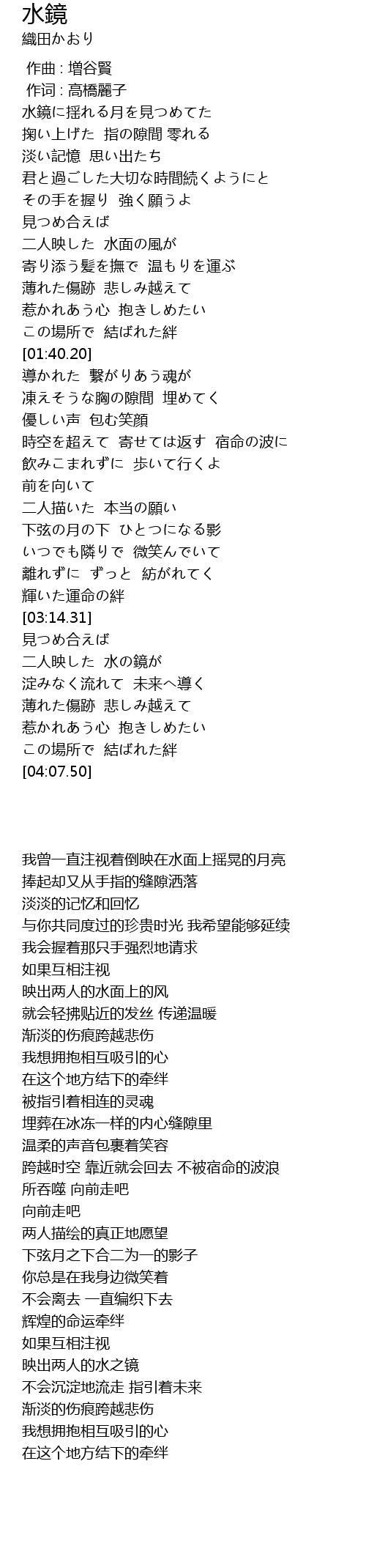 | [00:16.95] | 水鏡に揺れる月を見つめてた |