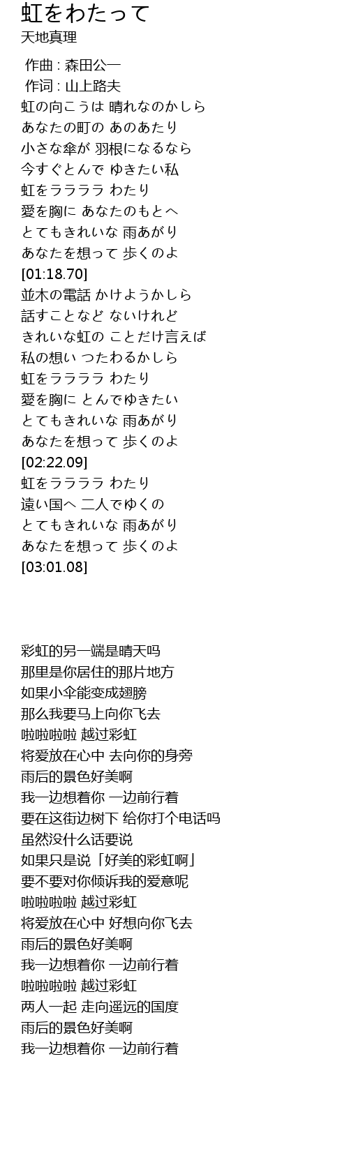 | [00:19.06] | 虹の向こうは 晴れなのかしら |