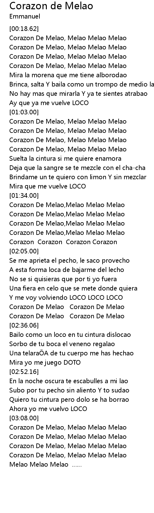 | [01:38.86] | Corazon De Melao, Melao Melao Melao |